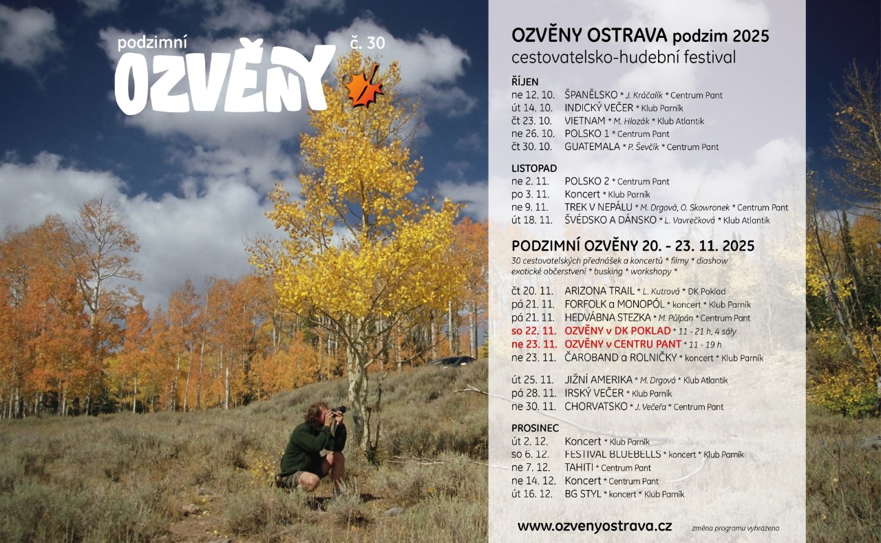 Hlavní program 30. festivalu OZVĚNY se bude konat 20. - 23.11. 2025 v DK Poklad, Centru Pant , Klubu Parník a na dalších místech v Ostravě.