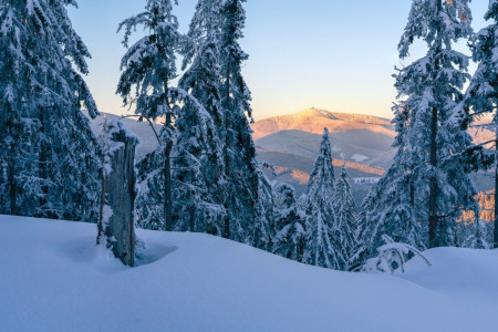 Pozdní slunce osvětluje vrchol Lysé hory. Pohled z Trojačky, kde se v říjnu 1944 utkala partyzánská brigáda Jana Žižky se třemi stovkami vojáků speciálního německého oddílu Ruhsam..jpg