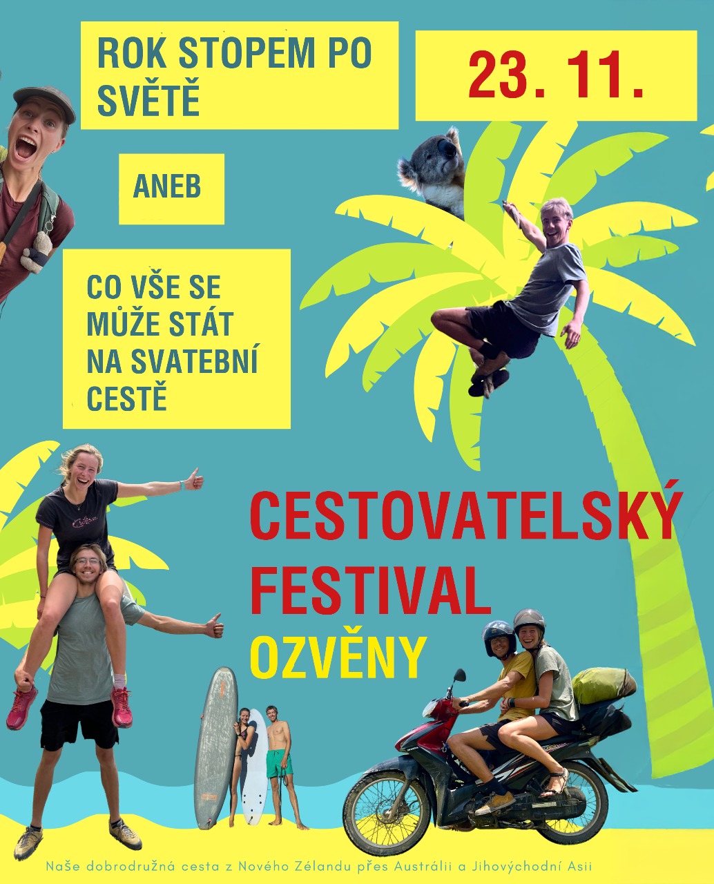 Cestovatelská přednáška, kde se dozvíte nejen skvělé tipy, jak na práci na Novém Zélandu, jak cestovat stopem a skoro zadarmo, ale povíme vám i naše nezapomenutelné zážitky a průšvihy o tom, jak jsme chytili zloděje na NOVÉM ZÉLANDU, jak jsme viděli koaly v AUSTRÁLII, jak jsme projeli VIETNAM na motorce, jak jsme se kodrcali LAOSEM, jak jsem dostala doživotní zákaz vstupu do části SINGAPURU, jak nás málem sežrali tygr v MALAJSII, jak nám lilo v THAJSKU, jak mě okradla opice v KAMBODŽI, jak jsme přežili full full vlaky na SRÍ LANCE a mnoooho dalšího.