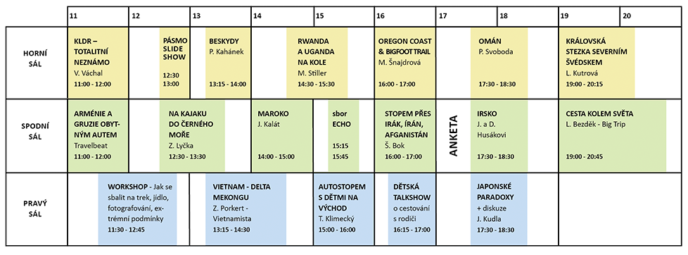 11.00 - 12.00 ARMÉNIE A GRUZIE OBYTNÝM AUTEM - Travelbeat * 12.30 - 13.30 NA KAJAKU Z ČERNÉHO LESA DO ČERNÉHO MOŘE - Z. Lyčka * 13.45 - 14.00 INDICKÉ TANCE - L. Janíková * 14.00 - 15.00 MAROKO - J. Kalát * 15.15 - 15.45 SBOR ECHO * 16.00 - 17.00 STOPEM PŘES IRÁK, ÍRÁN A AFGHÁNISTÁN - Šebastián Bok * 17.30 - 18.30 IRSKO - J. a D. Husákovi - Husy na cestách * 19.00 - 20.45 CESTA KOLEM SVĚTA - L. Bezděk - Big Trip